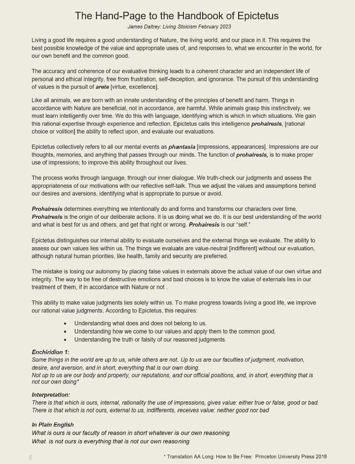 Like all animals, we are born with an innate understanding of the principles of benefit and harm. Things in accordance with Nature are beneficial, not in accordance, are harmful. While animals grasp this instinctively, we must learn intelligently over time. We do this with language, identifying which is which in which situations. We gain this rational expertise through experience and reflection. Epictetus calls this intelligence prohairesis, [rational choice or volition] the ability to reflect upon, and evaluate our evaluations.