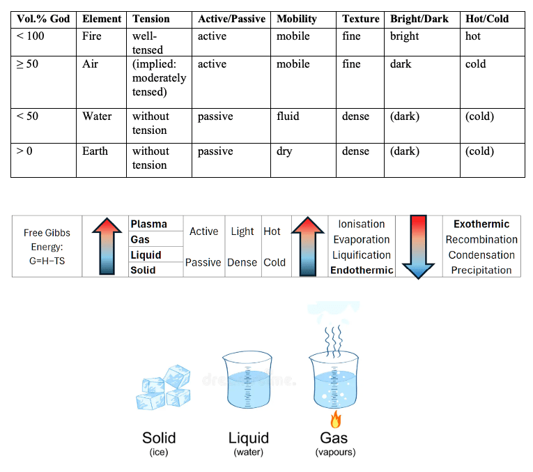 The four elements are phase states, solid, liquid, gas, and plasma, different energy states of the unified substrate, varying in temperature, density and activity,